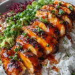 Imagine serving this vibrant dish at a cozy dinner gathering or an intimate weeknight family meal. The sight alone—golden-brown chicken topped with a glossy glaze resting atop fluffy, aromatic rice—invites you to savor every moment. The crunch from the green onions and the subtle hint of lime join in harmony, creating a feast for both the eyes and taste buds. It’s a beautifully layered experience that invokes warmth and satisfaction, offering comfort through food in the most delightful way.